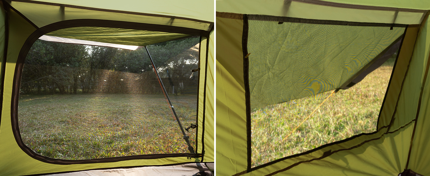 UPGRADED DOME TENT WITH VENTILATION Enjoy the upgraded dome tent construction with generous standing height. Mosquito nets on doors and windows provide air circulation and make this tent ideal for travel and touring.
